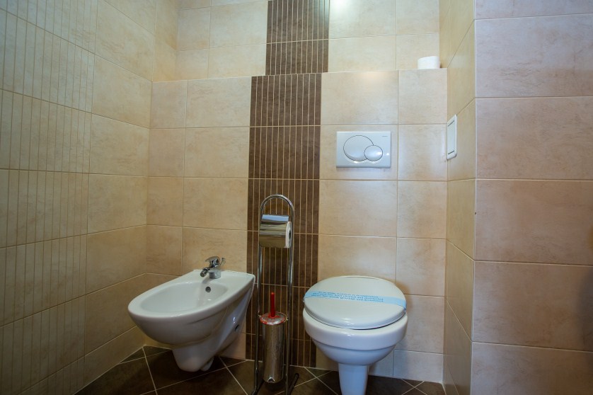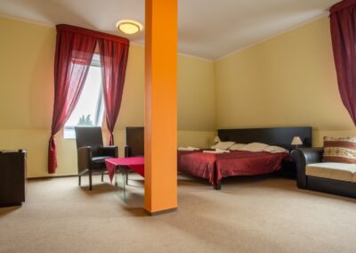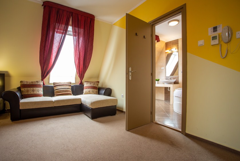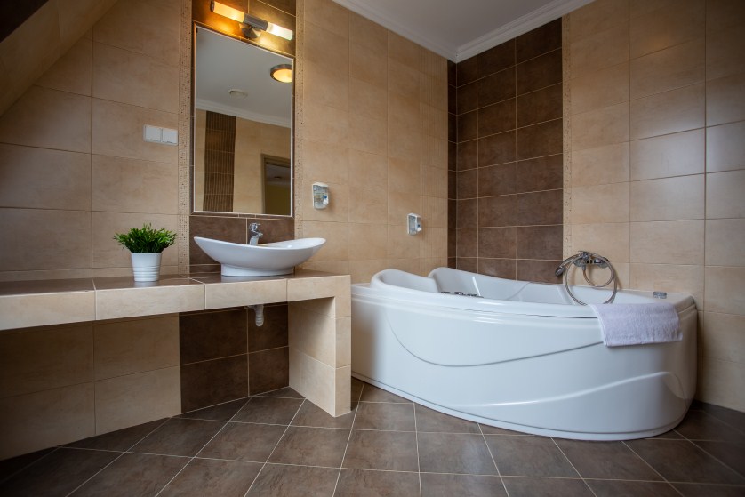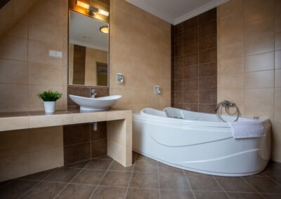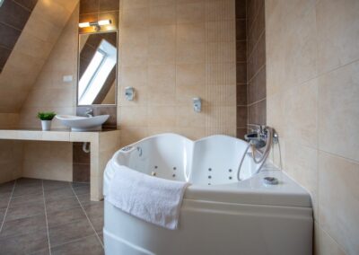 Egylégteres, hangulatos szoba nagyméretű hidromasszázs káddal.